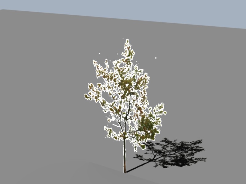 Creo un plano en Blender, le creo un material y le creo una textura de tipo imagen. Le asigno la textura de árbol con transparencia (en f6) y en la pestaña de map image pulso sobre el botón de use alpha. Si renderizo, veo enseguida que no funciona. Vuelvo a la parte de materiales (f5) y pulsa sobre ztransp en la pestaña de enlaces and pipelines. Renderizo y veo enseguida que sigue sin funcionar. Voy a la pestaña de texturas (la de la zona de materiales) y, aparte del col, selecciono alpha. Renderizo y veo que casi, pero no. Ahora bajo el alpha del material hasta cero. Y premio, aunque se ven reflejos especulares no deseados, que puedo eliminar bajando a cero el Specular de la pestaña de Shaders.