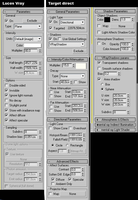 El principal problema en el que me he encontrado es en la luz ambiental, no sé cómo hacer para que se me ilumine todo, antes con el Mental Ray usava la skylight, pero ahora me cuesta mucho. Tengo la escena iluminada con 3 lueves Vray que hacen de ventana en un lateral, una de ellas cae encima de la mesa del rendre, otra por el fondo de la escena que no hace casi nada, debería subirle la potencia, luego en todo lo que es el techo otra Vray light con poca potencia para intentar iluminar un poco la escena y una Target Direct que en teoría debería de hacer el papel del sol, pero no hace lo que me esperaba. Bueno, aquí os pongo el render como lo tengo en estos momentos y los parámetros de las luces, a ver si me podéis echar una mano.