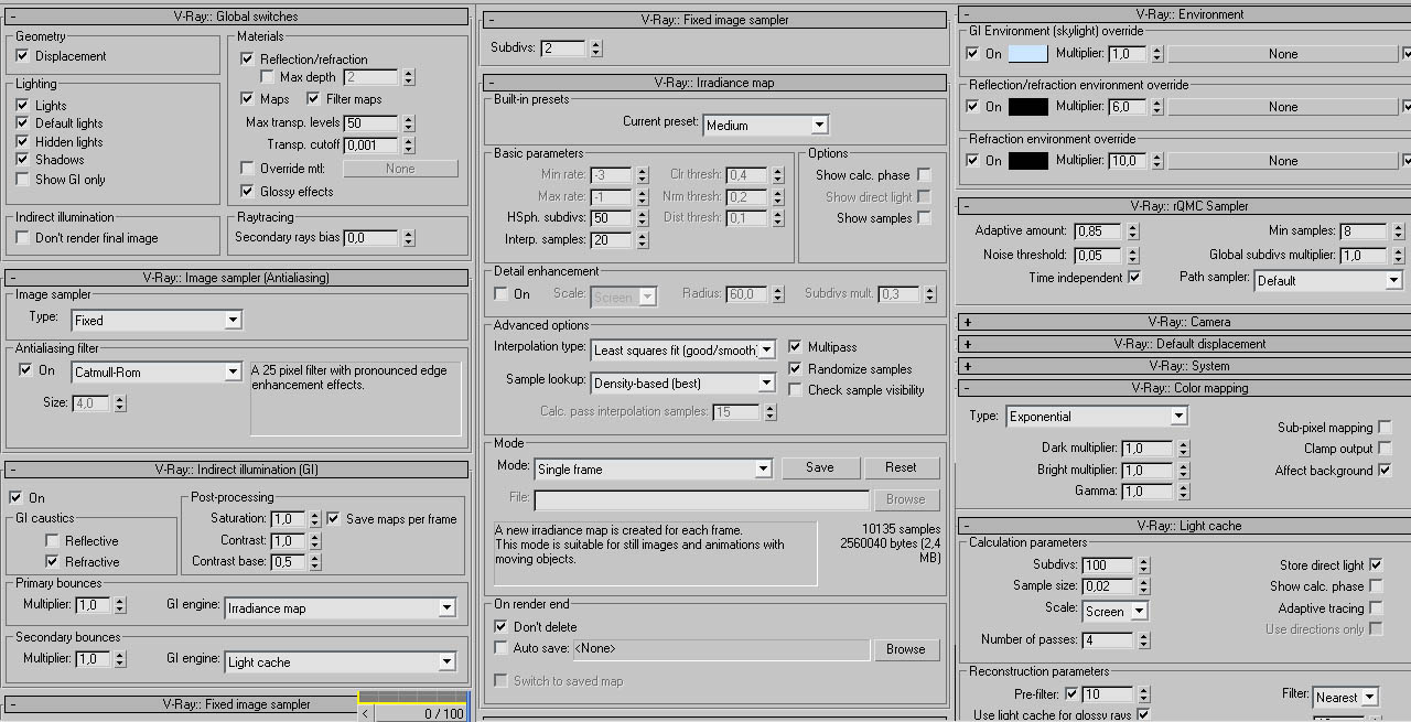 Hola amigo, bueno yo también estoy empezando con Vray el otro día hice un tutorial que al final me dió buenos resultados, te dejo el enlace por si te quieres mirar algún parámetro.