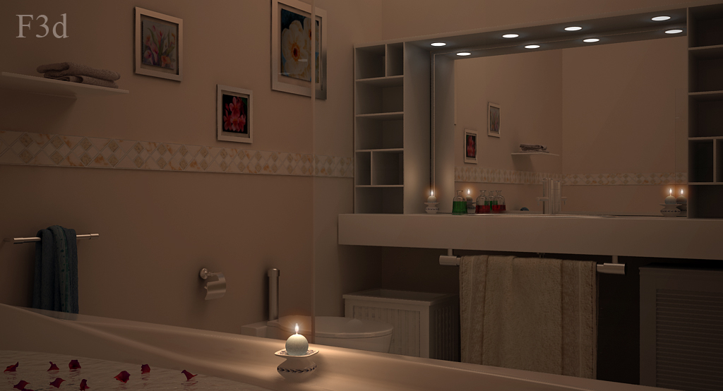 Primero he de decirte que ojalá supiera hacer algo como lo que tú has hecho porque me parece una pasada. En cuanto a los comentarios (qué fácil es buscar fallos). Además, de los del agua y de la iluminación que te han dicho, el borde la bañera aparece como a escalones y en la zona de la mampara hace un efecto extraño que de hecho, se superpone sobre la toalla, pero a la vez es transparente (algo raro), también me parece extraño que en el espejo no se refleje la mampara. En fin, que hasta a Jessica Alba se le puede encontrar defectos. Un saludo y insisto que ojalá pronto pueda hacer cosas como esa.
