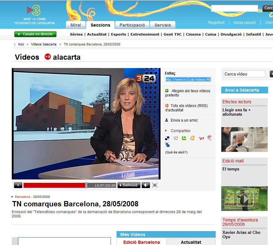 Gracias a Rebeca, he podido saber que un render que he hecho ayer salió en el TN comarques de TV3. Sale poco, así que, estar atentos al momento 13.57 (después en la noticia sale un poco más): TN comarques Barcelona, 28/05/2008 - Televisió de Catalunya.