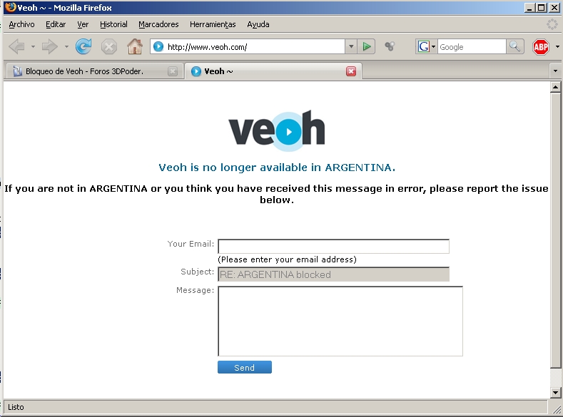 Yo no soy usuario habitual de Veoh, pero hoy por hola un enlace me llevó hasta, allá y me enteré de toda una movida bastante radical que ha pasado en estos 2 últimos días. Veoh debido a un cambio de política ha bloqueado el acceso a una serie de países, la razón del bloqueo es debido a la baja concentración de usuarios en esos países, mejor pego la cita.Están en todo su derecho de hacer lo que quieran con su servicio, me imagino que no les salía rentable hacerlo a nivel mundial. Sólo aviso para que si quieren difundir sus contenidos sepan que no se podrán ver a través de Veoh en los siguientes países (lista no oficial, puede que sean más).Cita: