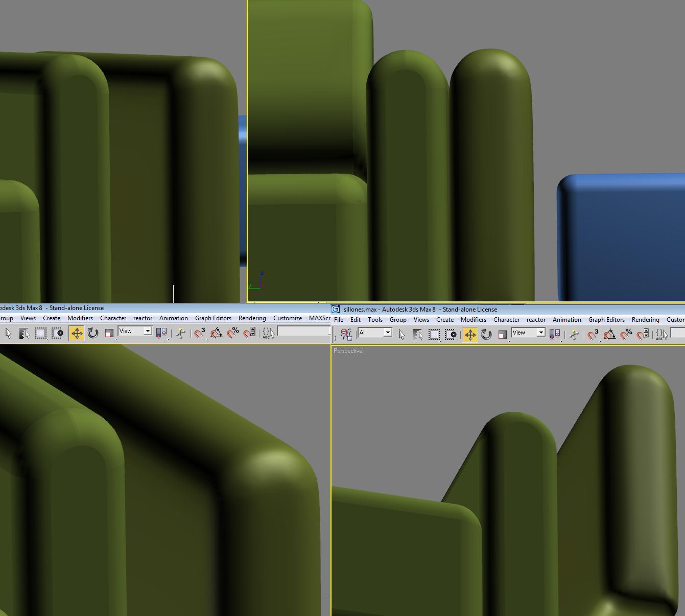 Hola a todos veréis hace tiempo que ando por este magnífico foro, donde he publicado más de una respuest y publicado algún trabajo, veréis tengo un problema, he modelado un interior básico, con unas sillas, y ahora me disponía a modelar un sillón, pero quería modelar del estilo como el que tenía de una librería, parecido al del salón de mi casa, y la cuestión es la siguiente, no logro conseguir la técnica para copiarlo, empiezo por un Chamferbox y con Editable Poly y TurboSmooth, pero no se parece exactamente, se le parece, pero no es esa técnica, la del sillón de la librería es un editable Mesh, como va esa técnica, os enseño una captura del sillón, que está a la izquierda y el cómo he empezado el mío la derecha, un saludo.
