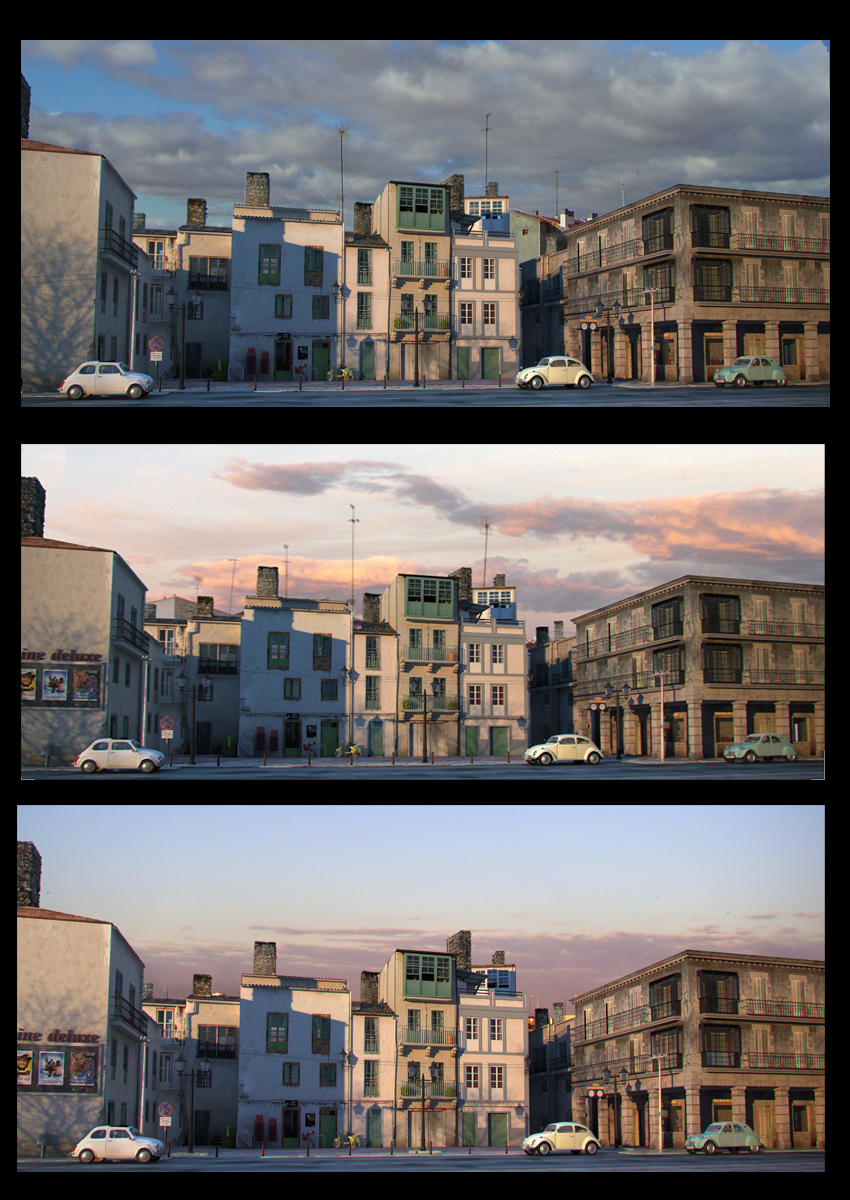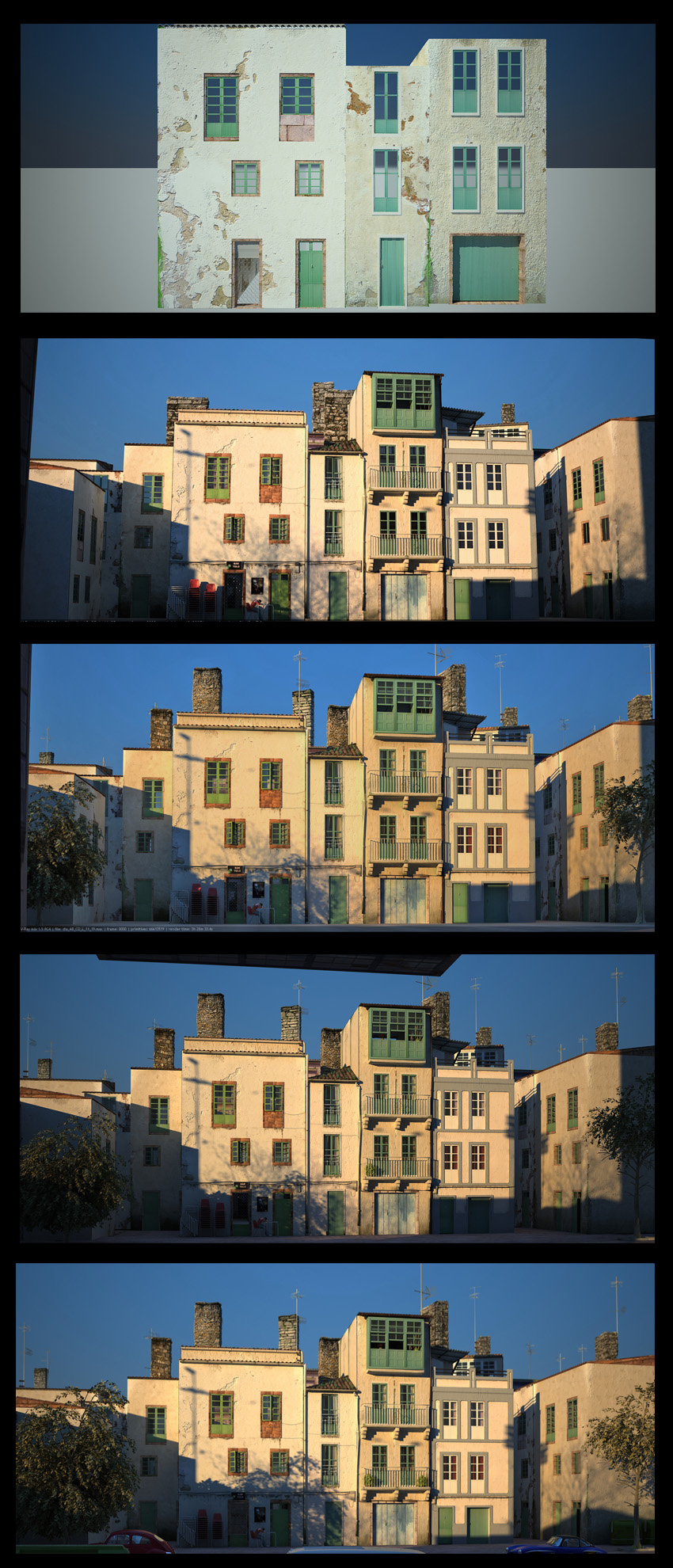 Ahora os dejo unas secuencias de cómo fue el desarrollo de la escena para que veáis las vueltas que le di al entorno, no tanto a los edificios principales.