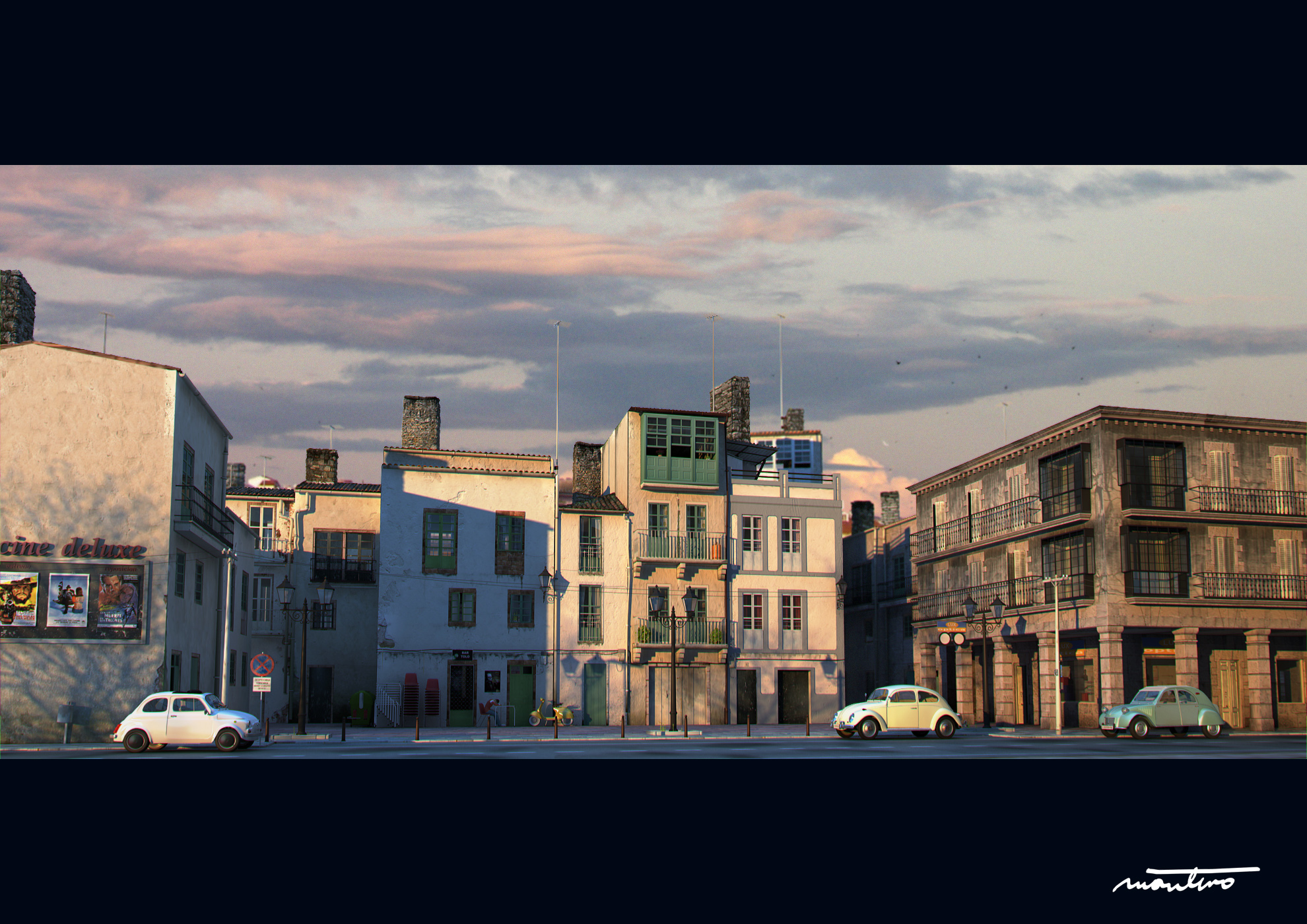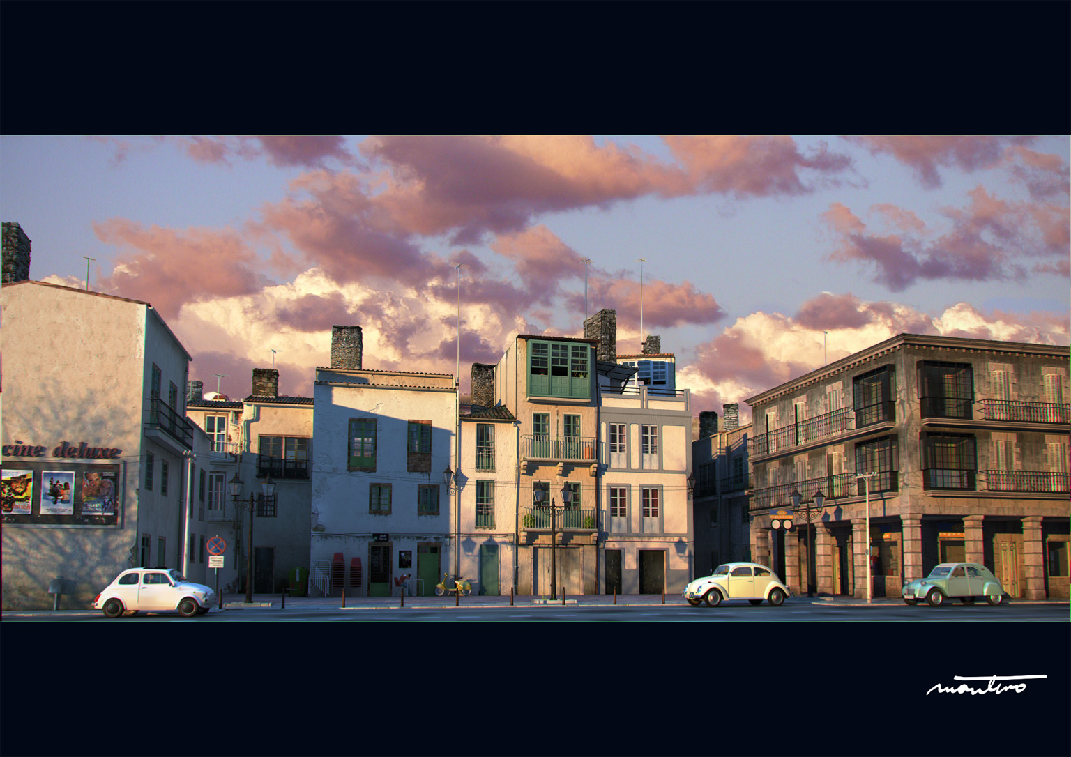 Hola os enseño mi último trabajo, que he realizado por puro placer en mí tiempo libre, me ha llevado unas 200 horas entre todo el proceso, de las cuales al menos 3/4 han sido por no tener claro la composición de la imagen, ni siquiera los edificios contiguos a los principales, en fin, entre tantas horas me ha dado tiempo a aprender muchas cosas así que, bienvenidas sean las horas de estudio, la idea es que es el año 1970 y es verano, es amanecer y todo dios esta durmiendo en casa, menos los chavales que quedan por los bares, y alguno que está perjudicado por las copas que se ha tomado y duerme plácidamente en una mesa delante del bar que ha cerrado, 3dsmax 9+ Vray 1.5