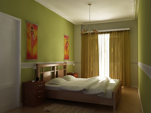 Las líneas de fuga dirigen la vista hacia el punto de interés de la escena. Tu no te das cuenta, pero tus ojos siguen involuntariamente esas líneas. Por eso es importante que sigan un sentido lógico. En tu escena se concetra el peso en la parte inferior derecha. La vista entra por abajo a la izquierda, sigue por la cama y se va por la caja de la persiana. Como esta no sigue correctamente las líneas de fuga, molesta el espacio de pared que hay a continuación. También tienes que compensar el peso que tiene una parte de la imagen con el vacío que queda en la otra. Si pones un cuadro sobre la cama lo solucionas fácil. Te adjunto un pequeño croquis explicativo.
