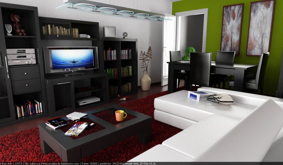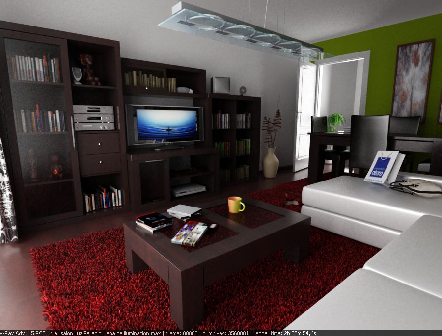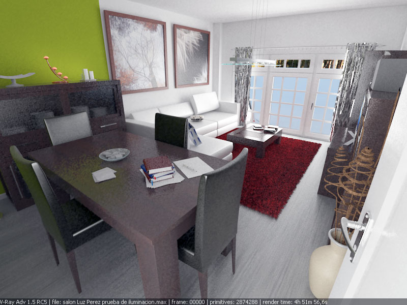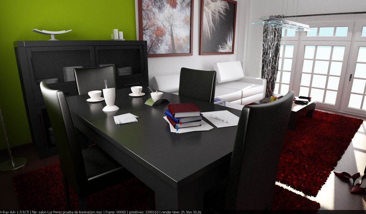 Esto está mucho mejor, veo que has hecho los deberes este fin de semana. La alfombra definitivamente sí, es demasiado grande, déjala sólo en la zona del sofá o en la zona de la mesa y las sillas, o coloca 2 alfombras en vez de una, como quieras, pero es demasiado grande. Parece que sigue habiendo ruido en el cristal del mueble de la tele y en algún sitio más, puede que sea por la Vray light (tenías alguna colocada, ¿verdad?), prueba lo siguiente: en las opciones de la luz activa la casilla estore with Irradiance Map, y en la persiana de Light Caché desactiva estore Direct Light, a ver si sirve, si no cambia es cosa de los materiales, pero creo que ya tenías las subdivisiones bastante altas, definitivamente está mucho mejor, la vista es mucho más interesante. Ánimo.