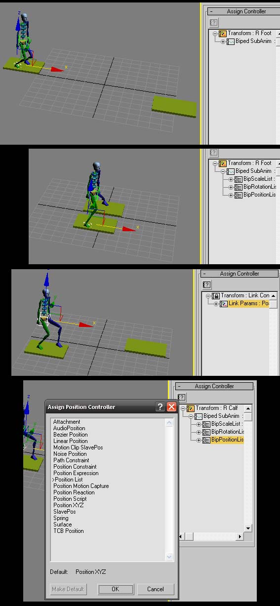 Hola chicos, tengo una duda similar al problema de la moto. Tengo 2 plataformas animadas, una va de izquierda a derecha, y la otra de derecha a izquierda, encima de una de las plataformas esta parado el Biped, con los pies atachados en planted key con respecto de la plataforma. La idea es que justo en el momento en que se encuentren alineadas las plataformas, el bípedo se anime para pasar de una a la otra. Sé que hay un método de hacer esto con elementos normales, el enlace constraint en el apartado de motion, con el cual puedes hacer un cambio de enlace y registrarlo en la línea de tiempo, pero éstas opciones no son iguales en el bípedo. Así que lo que se me ocurrió fue linkear el com del Biped a un helper, y desde ahí hacer las operación, pero por lo que estuve experimentando, ese no es un buen método, ya que, causa un pequeño error al moverlo con los planted keys. Sabéis cual es el método correcto para hacer éste simple ejercicio? Gracias.