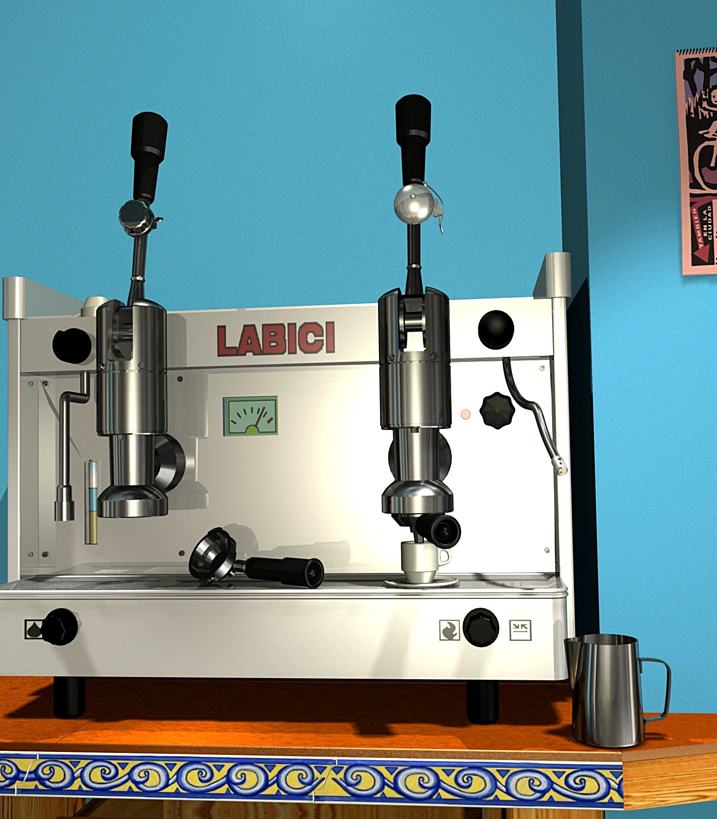Esta cafetera, existe y ya ha suscitado la creación de otras obras gráficas, - Siempre inspiradas por temática ciclísta, alguna de las cuales pensé incluir en la escena, pero por las cosas de los derechos de autoría y posibles heridas en otas susceptibilidades, he cambiado el libreto y solo incluiré alguna cosa de mi almacenillo, que para eso lo tengo.