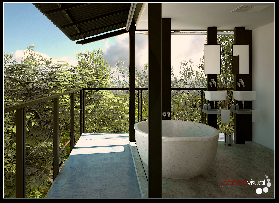 Felicidades Tecnikvisual, está muy bien el trabajo, pero si me permites una crítica, se nota que está modelado las cosas, sobre todo los elementeos de baño, como grifo y esas cosas, creo que necesita en ese aspecto algo más de curro, los árboles también se notan un poco raros, prueba a ver con algunos modelos de árboles de Evermotion sobre todo de unos de los últimos volúmenes que hay unos árboles muy buenos y seguro que al ser árboles modelados se te quedará mejor la escena, en cuanto a iluminación solo una palabra perfecto, felicidades.