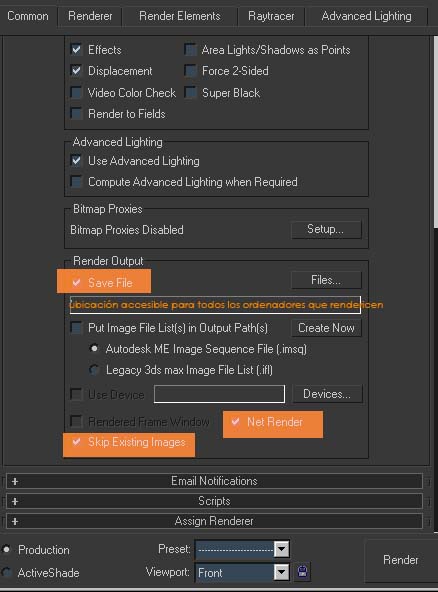 Desmarcamos rendered frame window y marcamos net render y Skip existing images.