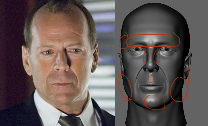 Creo que sigues teniendo problemas de proporcón como comenta Outsider. Ten en cuenta una cosa, en algunas películas Bruce Willis esta caracterizado, y creo que la imagen de más arriba de este hilo es una de ellas.