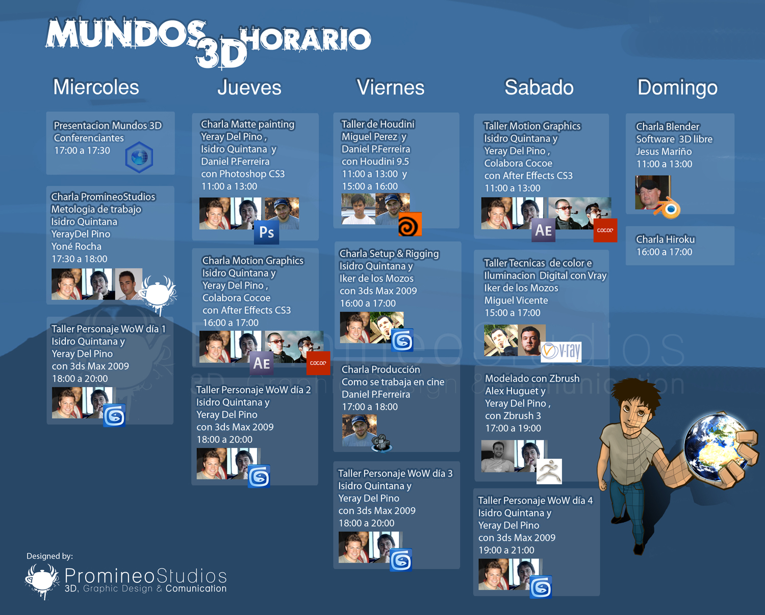Promineostudios es un estudio de 3d e infografía, diseño gráfico, diseño y desarrollo web, y comunicación audiovisual digital que nace con el objetivo de cubrir todo tipo de servicios y soluciones de comunicación en las islas Canarias, promineostudios es un grupo de jóvenes emprendedores, con gran experiencia en el sector, cada uno de ellos especializado en una rama de las artes digitales. Entre ellos YeraY del pino e Isidro quintana organizadores del evento. Promineo Studios.:3d, infografía, diseño gráfico, diseño y desarrollo web: