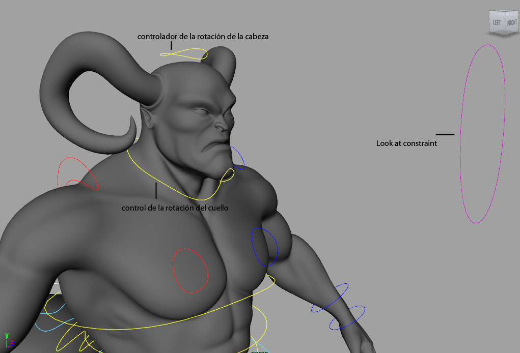-Hueso de la cabeza desconectado del hueso del cuello, le hacía un padre (un grupo) y este padre tenía un position constraint al hueso del cuello. De esta manera cuando roto el cuello la cabeza se mueve siguiendo el cuello, pero no rotaba.