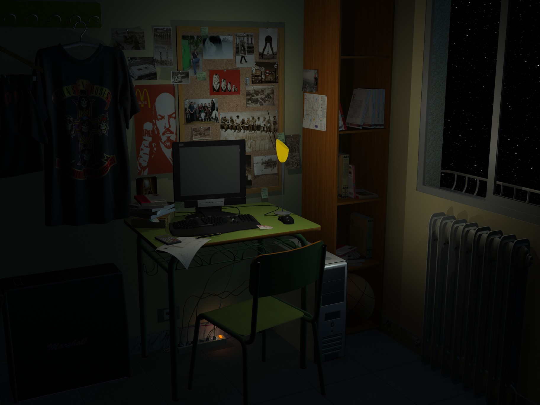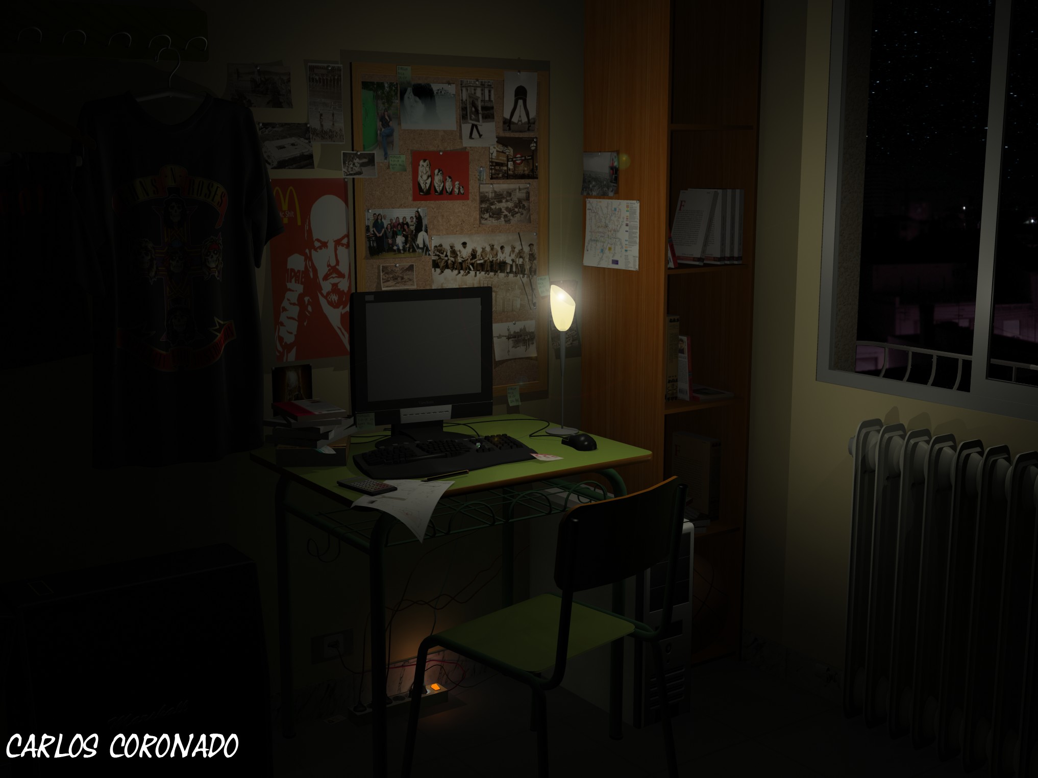 Ya sé que la mesa y la silla es como si la hubiera robado del cole, pero este render formara parte de un trabajo para explicar a profanos cómo funcionan los materiales en Mental Ray y creo que el metal verde de la mesa dará muy buenos resultados con el render diurno y podrán entender bastante bien como reaccionan los metales según el tipo de iluminación.