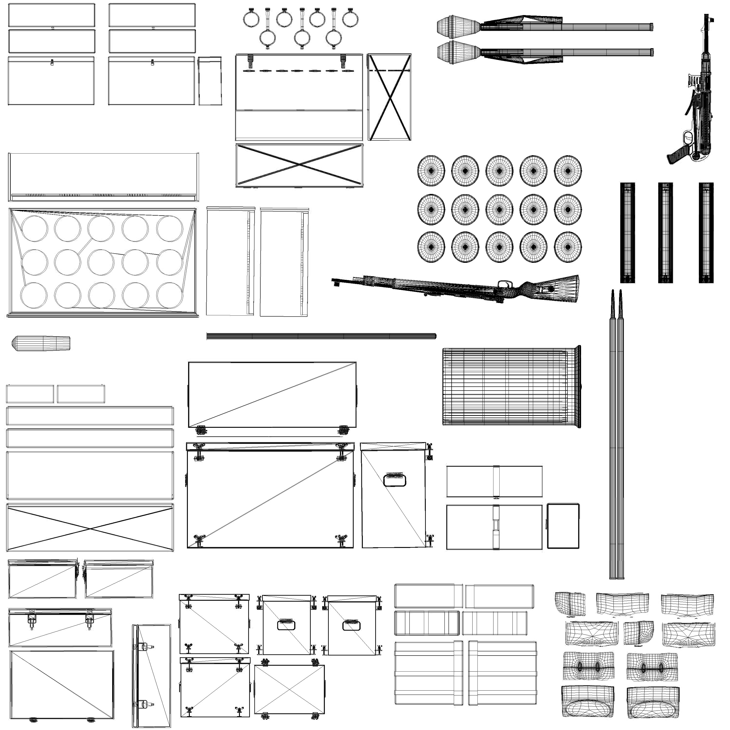 Un poco de equipo, aquí he tratado de ahorrar modelado y he pillado de librerías gratuitas, la metralleta y el casco y una mg42 que he encontrado, aunque realmente necesito una mg-34. Me faltan un par de fusiles máuser o Gewehr si alguien tiene alguna de esas armas y me las quiere prestar, si son en lowpoly mejor, pero no le hago ascos a un High Poly.