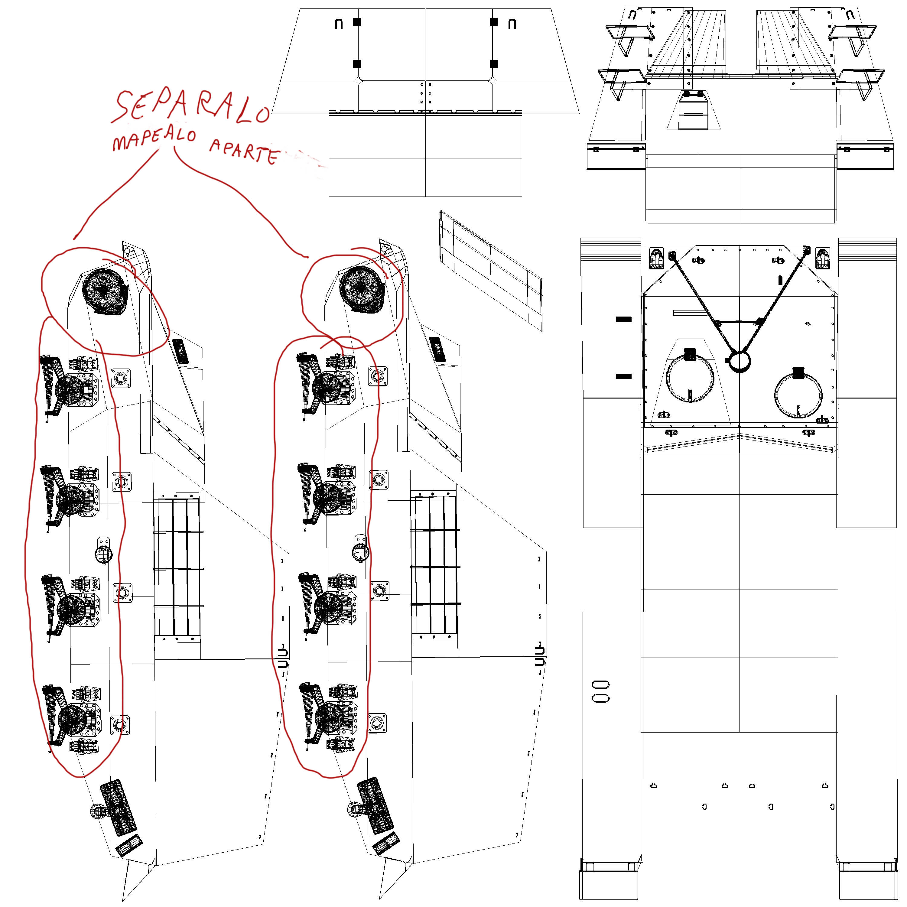 Es lo que tiene esto de los tanques, que tiene mucha superficie que hay que tapar con unas texturas de aceptable calidad en cuanto a resolución. Yo personalmente he cogido la manía de hacer 3 mapas, 1 con todo es decir la barcaza y demás de 5000 por 5000, otro para la tracción de 2000 por 2000 y uno para las orugas 1024 por 1024 y me va bien el sistema, y ahora creo que metiste todo en uno ¿no? Ese no tendrá 2000 por 2000? Porque esa resolución es muy pequeña.