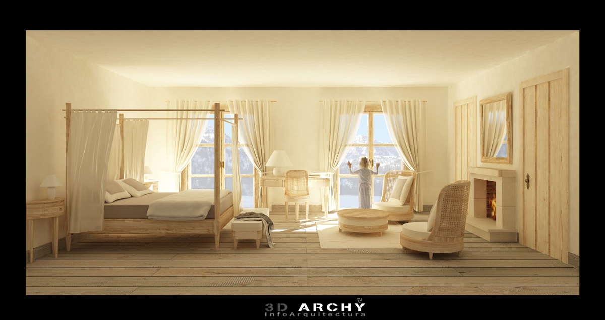 Gracias a todos, el sunto del tamaño del suelo fue pedido así por el cliente, se trata de un proyecto encargado para un hotel en los Alpes franceses, por ello tiene ese carácter rústico. En cuando a la escala de los muebles, es la correcta, entiendo que son muebles poco vistos, han sido modelados exclusivamente para una firma francesa, que es la encargada de decorar el hotel, los butacones junto a la chimenea son tan grandes en la realidad como veis en la información. No nos permitieron meter nada de decoración que no fuese el mobiliario diseñado por ellos (no hay cuadros, adornos). En el trabajo final nos hicieron quitar la niña. En cuando a la duda de Tecnikvisual, este tipo de piscinas tienen un rebosadero que funciona a modo de canalón que devuelve el agua a la piscina. Gracias otra vez de parte de nuestro equipo.