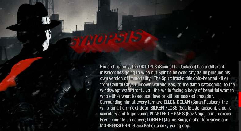 Esperemos que Will Eisner no se remueva en la tumba. La única chica que se le conoce a Spirit es la hija del jefe y alguna que otra vampiresa que aparece de vez en cuando a comerle la moral. En el tráiler parece como si fuera de casanova por la vida. La parte dibujada esta de lujo, eso sí. Saludos.
