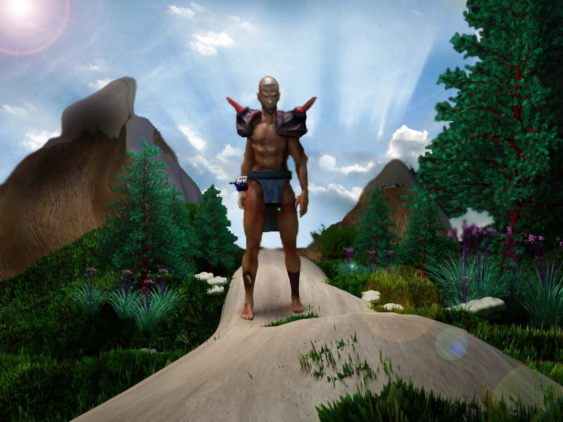 Este es un personaje skinneado, que postura en un escenario, el render es en Vray y el cielo y Lens Flare son hechos en Adobe Photoshop.