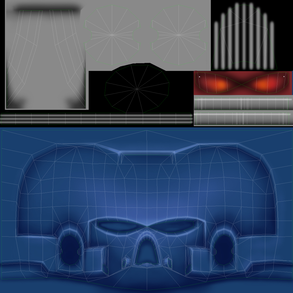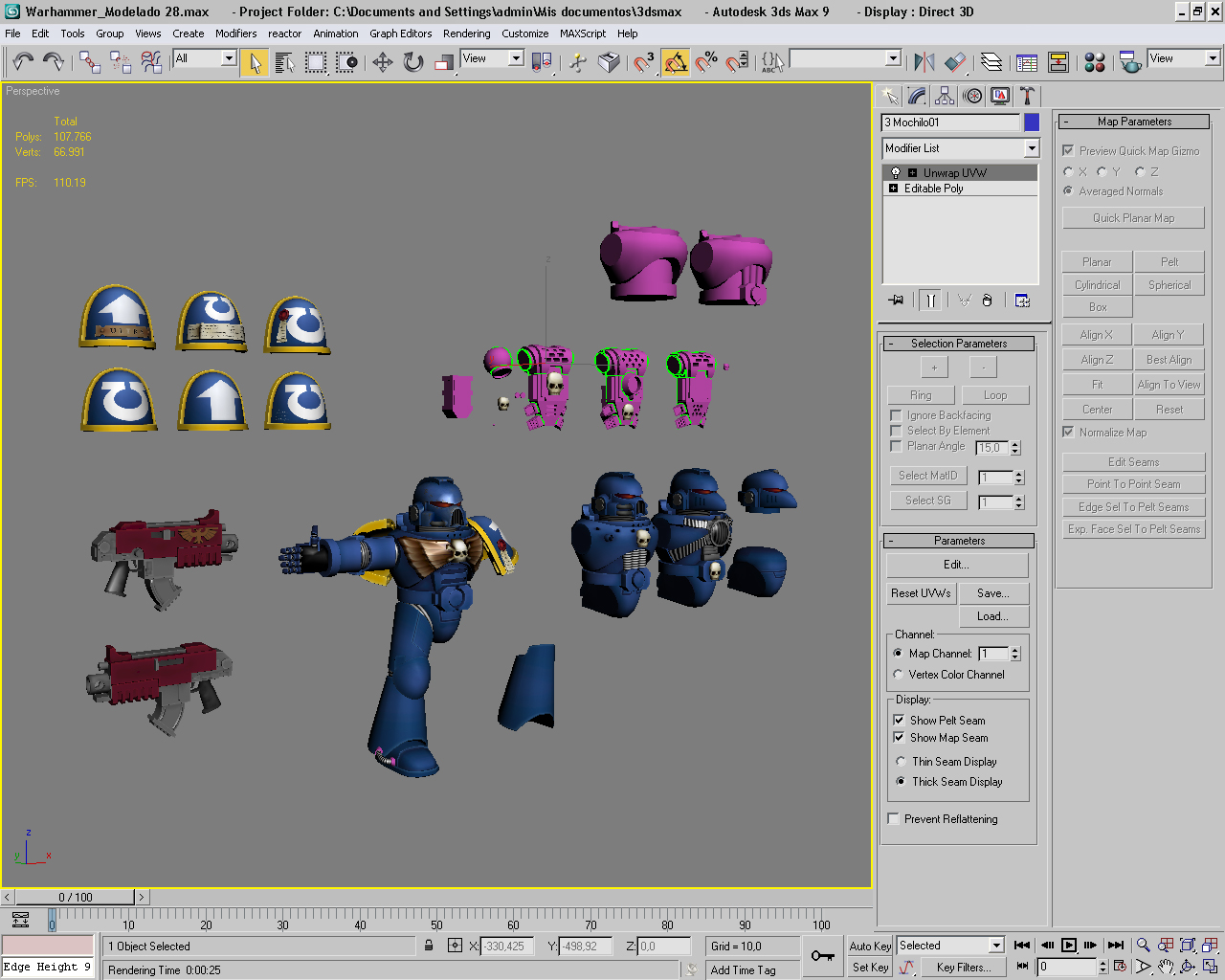 Ya he pre-texturizado (presentado la textura) casi todo lo que tengo modelado. Podéis ver que ya tengo variantes de la coraza, de las piernas y los cascos; mezclandolos haré los diferentes marines. El casco montado en el marine tiene más trabajadas las texturas. Os incluyo una imagen del proceso de texturizado. Os diré que lo que más me está costando es mapear los modelos. Justo ahora estoy con las mochilas, que son difíciles, pero casi están ya.