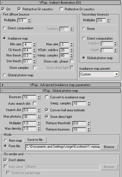 Datos. Una direccional con el mult 1 y 800 Diffuse subdivisiones, Vray shadow, search/max density 5/1, retrace 0, bounces 10.