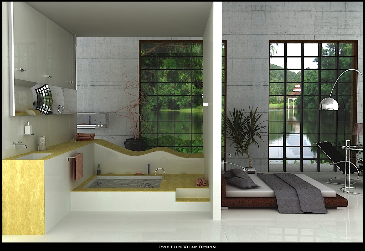 Hay que informarse un poco de los tamaños reales de las cosas, esa cama no puede medir menos de 190 por 150 y puede que sea más grande, y la mesita Eileen Gray es minúscula en la realidad, esa está totalmente desproporcionada. El sillón negro también, o la cama es pequeña. Por otro lado, también veo problemas con la altura y proporciones de los sanitarios en el baño de la 4ª imagen, una bañera no levanta mucho más de 40 centímetros del suelo y los lavamanos por lo menos están a 90cm.