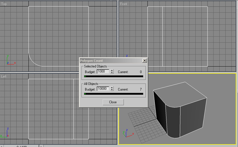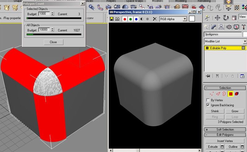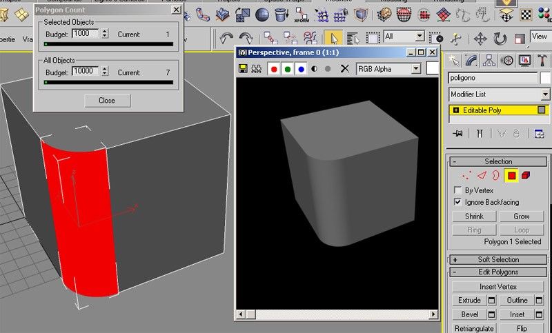 Comprobad e iros a nivel polígono del editpoly. Los polígonos bajan a la mitad. Lo que me gustaría hacer es poder agrupar las zonas curvas con el editpoly para que fueran un solo polígono. El cubo que puse en el mensaje anterior tenía solo 7 polígonos y un bisel perfecto haciendo este método, pero cuando se juntan a la vez varias aristas biseladas no se puede remover aristas de en medio por que desaparecen los polys, si se consiguiera hacer lo que busco seria perfecto, por ejemplo, para Unwrapear fácilmente además de que habría muchísimos menos polígonos, pasaríamos de 5000 a 9. Igual no se puede hacer de ninguna forma, pero no sé, vosotros que sabéis más de max probad a ver qué se os ocurre. El primer caso también está bastante bien, pero es un coñazo estar en editmesh y no poder convertir a editpoly, aparte de que los polígonos no disminuyen realmente, bueno, a ver si no os liáis mucho y sabéis por dónde van los tiros, aquí va una captura de pantalla y el archivo *, max. Saludos.