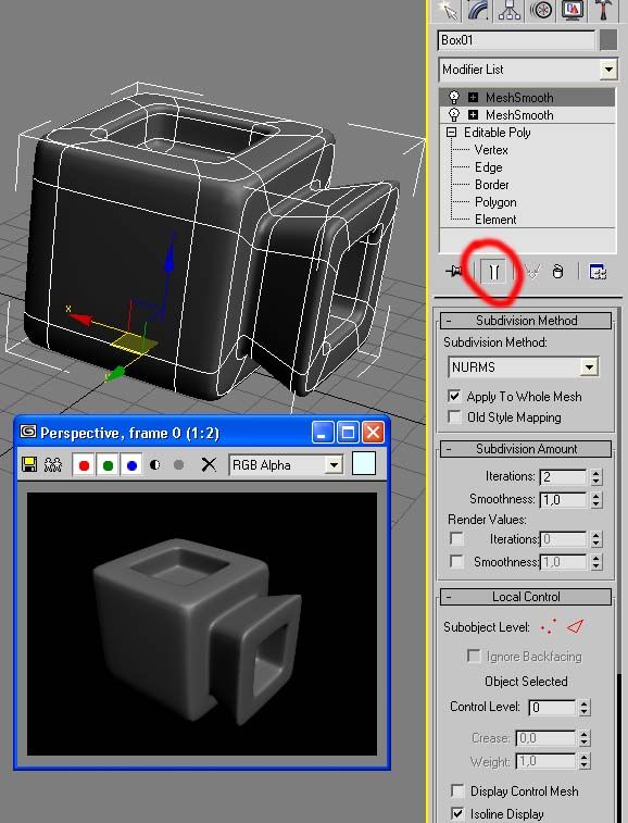 Ahora aplicamos otro modificador MeshSmooth, pero en este caso las subdivisiones serán en Nurms y las iteraciones serán 2, con esto le damos suavidad a los nuevos Edges que creamos.