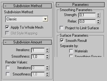 Luego aplicamos un modificador MeshSmooth con una iteración de 1, y con una subdivisión method puesta en classic, y por último en la pestaña parameters darle al strenght un valor pequeño, yo le he puesto 0,1 imagen 01.