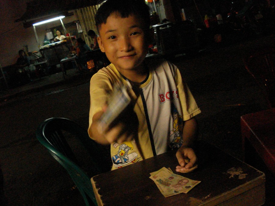 En esto que may se sentó con nosotros para vendernos su mercancía, y comenzamos a hablar con él. Tiene 10 años, y no va a la escuela porque sus padres le obligan a llevar dinero a casa vendiendo tabaco. Lo compraba unospreguntamás arriba, e iba haciendo la ronda por los bares de guiris vendiéndolo a un precio un poco mayor. De camino, se encontró con nosotros. En los 15 minutos que pasamos con él, perdí la cuenta de cuántas veces había contado su dinero. Creo que llevaba 65.000 dongs. 15.000 representaban sus ganancias, mientras que los restantes 50.000 los invertiría en comprar más tabaco. Le invitamos a una coca-cola.