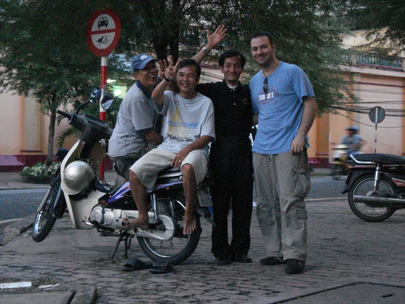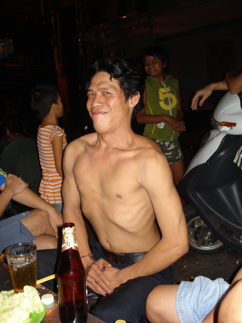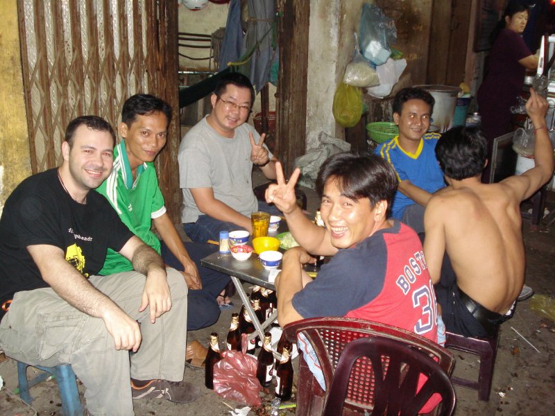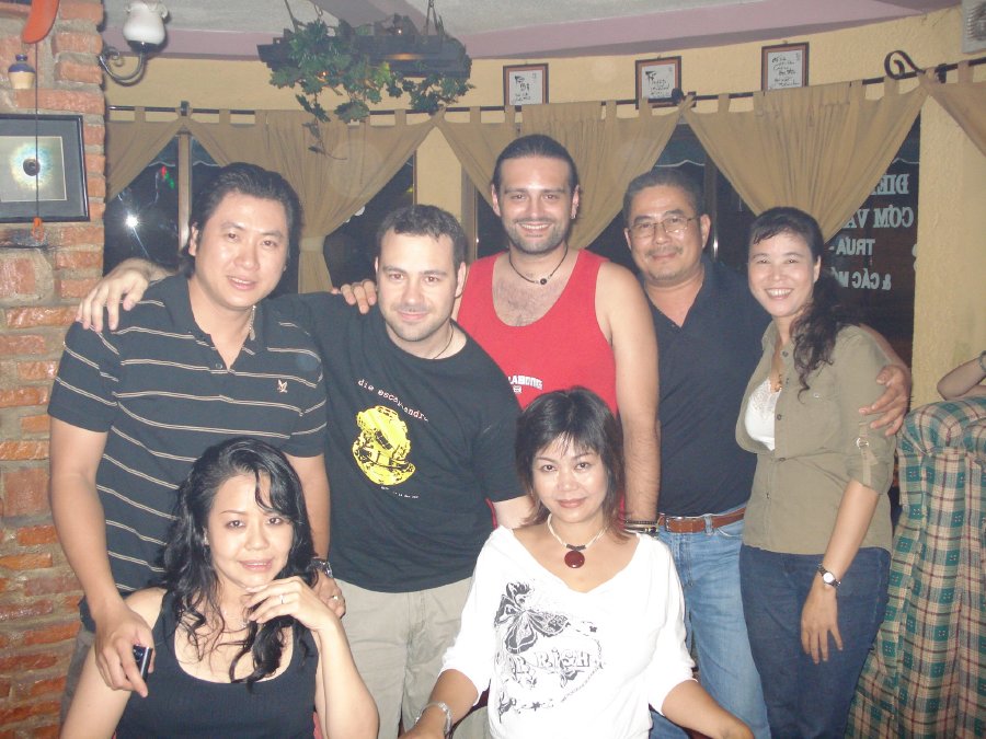 Echamos a caminar por dónde las motos nos habían llevado, buscando algún garito en el que gambitear un poco y gastar unos dongs. Al rato encontramos uno que parecía animado. Nos decidimos a entrar, y resulta que era un karaoke. Una vez dentro, nos dimos cuenta de que la razón por la que todo el mundo nos miraba era que éramos las únicas personas sin los ojos rasgados. Los únicos occidentales, vaya. Nos hicimos amiguetes de los del grupo de al lado, y tiramos unas cuantas fotografías. Una de las del grupo me dijo, incluso, que era very handsome. Creo que no me lo han dicho tantas veces en mi vida como en las dos semanas que pasé en Vietnam (y, ojo, no sólo me lo dijeron las esclavas). Lo raro es que me lo dijo con su novio al lado ().