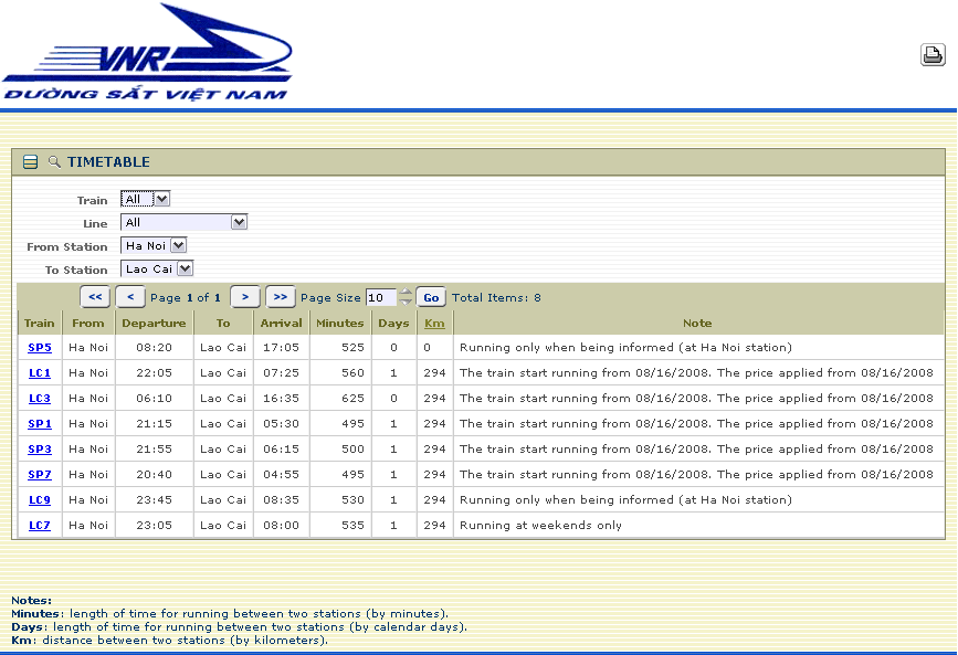 Si entráis en la web de Vietnam railways, podéis acceder a la tabla de horarios y rutas. Seleccionando Hanói y Lao Cai como estaciones de salida y llegada respectivamente, os encontraréis con lo siguiente: