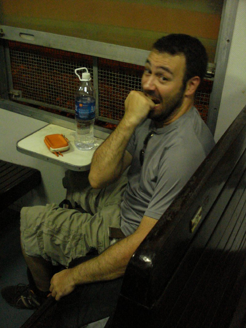 Haciendo unas sencillas cuentas, resulta que el tren va a la vertiginosa velocidad media de 35 km/h. Pero lo peor no fue la velocidad (que, al fin y al cabo, sólo influye en llegar antes o después) sino las condiciones del viaje. Imaginaros estar 8 horas sentados-recostados en un banco de parque, de esos de tableros de madera, pero con sueño, cansancio y soportando el traqueteo. El techo de los vagones estaba equipado con ventiladores para hacer más soportable la cosa, mientras que los fluorescentes los apagaron cuando salimos de la ciudad y se empezó a llenar el vagón de mosquillas.
