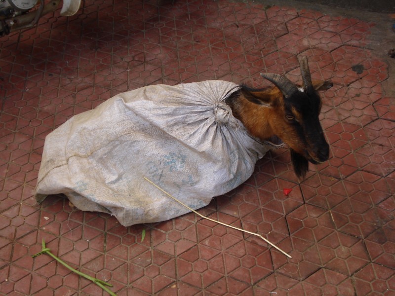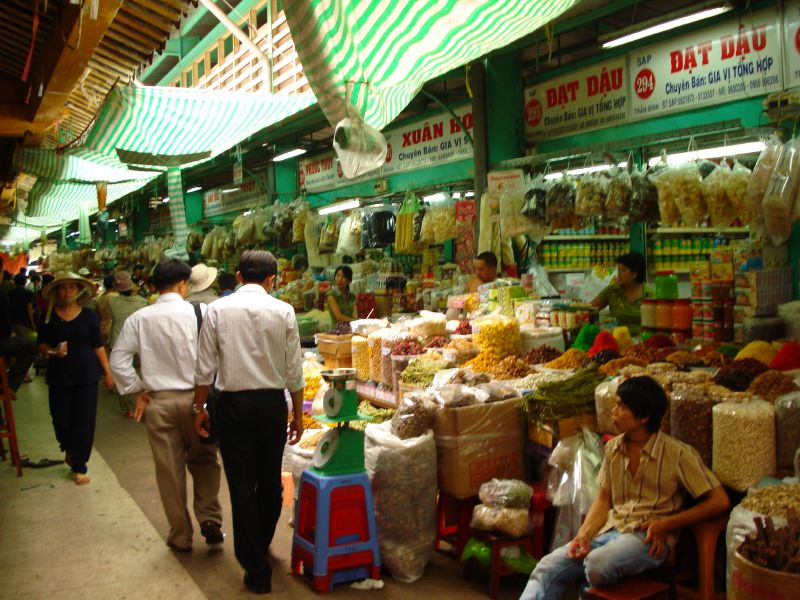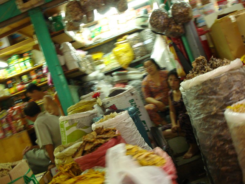 No me resisto a poner algunas fotografías de un mercado en el barrio chino de Saigón. ¿alguien quiere una riñonera? Al salir fuimos a buscar un sitio para comer, y acabamos en un puesto semi-callejero. Nos pusieron un pho con carne indefinida no nos acabó de triunfar mucho, así que, luego fuimos a por unos bocadillos de fiambre y vegetales que vendía mujer en su puesto-carrito. Tenían un ligero gusto amargo que soy capaz de recordar ahora mismo.