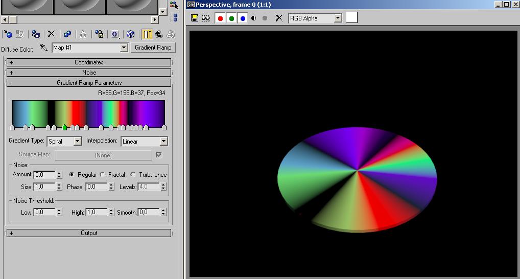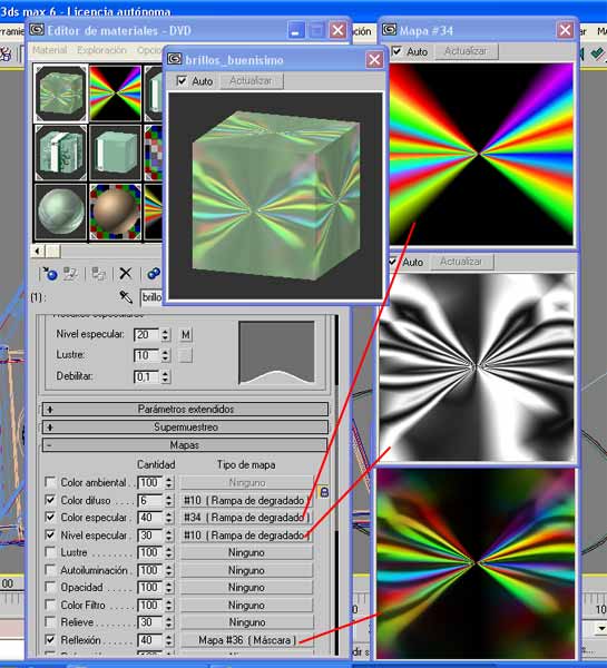 Estamos en ello, esto va tomando algo de color, estoy utilizando el mapa de gradiente Ramp, pero utilizándolo en los canales de reflexión y refracción. Tocando las curvas del mapa se consigue que tenga muchos más brillos.