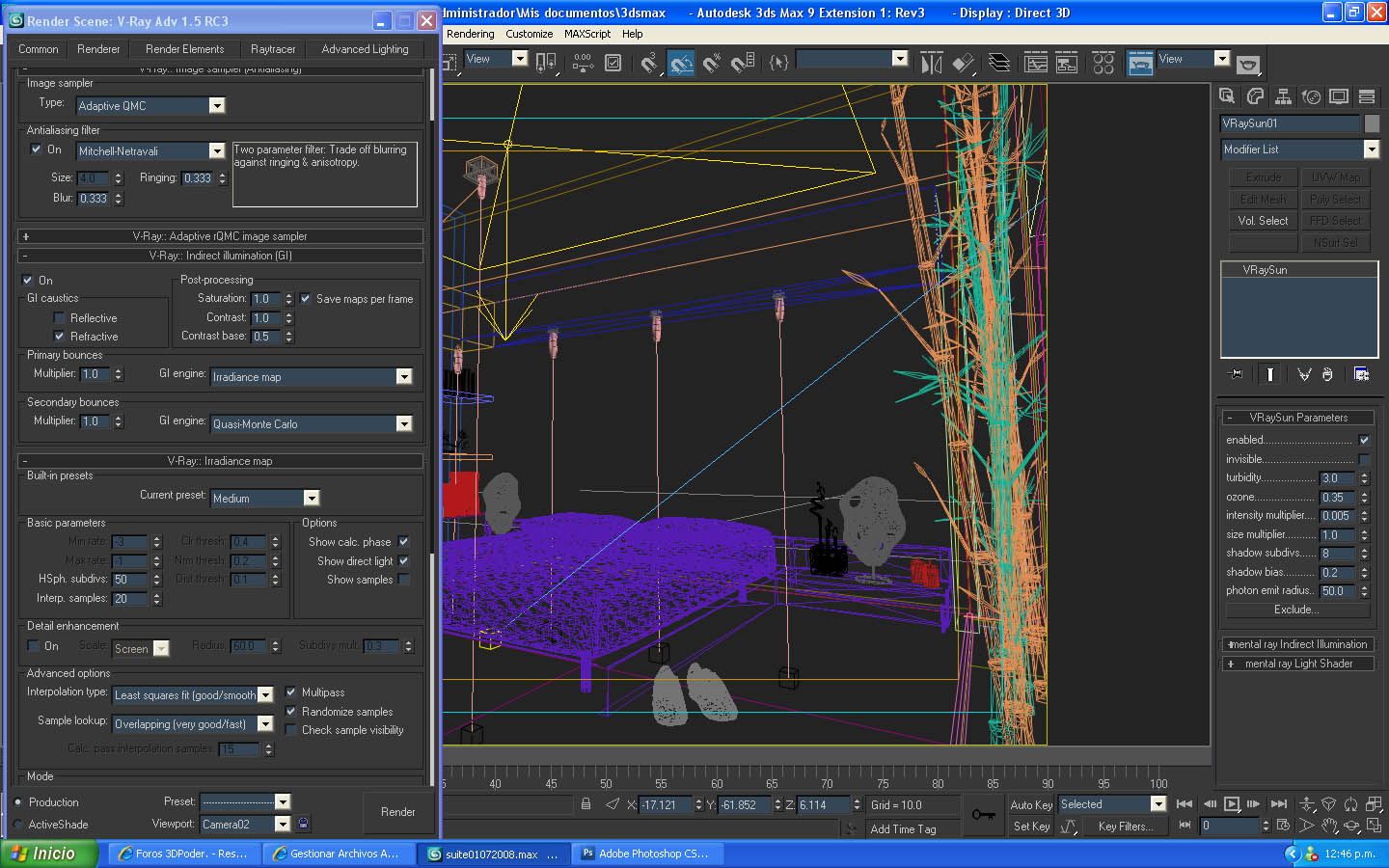 Tengo un Vray Sun con cámara Vray y la versión del Vray es la 1.50 rc3 mi principal problema es el tiempo y de renderizado y que no se cierre el max si le pongo el preset en high en el iradience map se me cierra el max, las luces que tengo son dos una en el techo y la del Vray Sun y algunos spots.