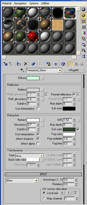 Por otra parte, al igual que aumentar las subdivisiones del reflect mejora la calidad del reflejo, las del refract mejoran la calidad de la transparencia del material y eso es necesario sobre todo cuando disminuyes el valor del glossiness en cualquiera de los dos casos (reflect y refract). Lo importante como te mencione previamente es no abusar de este valor ya que afecta el tiempo de render considerablemente. Saludos prafa.