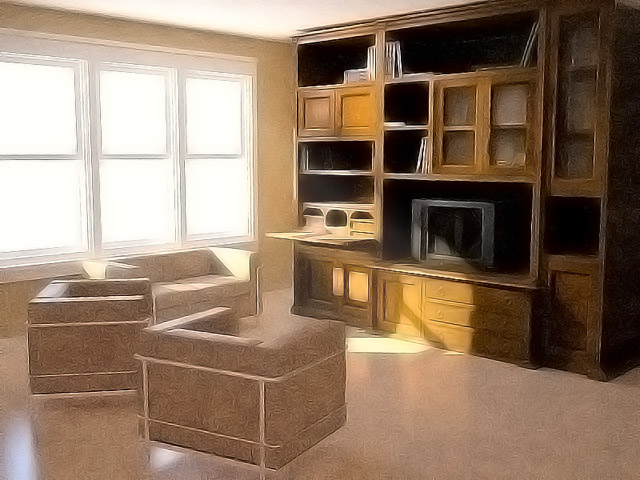 Interior salón. Destaco: el tiempo de modelado, apenas 20min, el tiempo de texturas e iluminación, apenas 10 min, tiempo de render, aproximadamente. 1 hora (sin duda le faltaba alguna más, pero bueno, no deja de ser una prueba) postprocesado, unos 10 min. Conclusión: trabajo poco tiempo, hace el trabajo duro el ordenador.