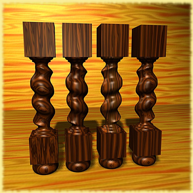 Aquí están las texturas para quién las quiera. Están creadas primero en Blender como mapa wood. En colrbands se eligen una serie de colores y en su caso grados de transpariéncia como en el ejemplo de imitación de pino en el que se han mezclado bands con rings.