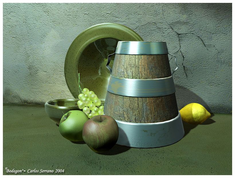 Hola. Os pongo mi último render. Una composición de un bodegón imaginario. Como siempre, 3dstudio Max 4.2 y Adobe Photoshop. Es sencillo, pero cómo me gusta cómo queda estéticamente, lo dejo así, en principio. Espero que os guste. Saludos.