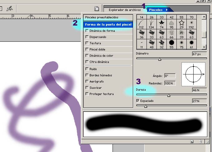Aún no he probado el Adobe Photoshop 8, sí, la dureza está más a mano, pero ojo debería de estar acompañada por el espaciado, a veces por más que utilices la punta más dura o más suave se te hará difícil integrar distintos Trazos si no tienen el espaciado correcto.