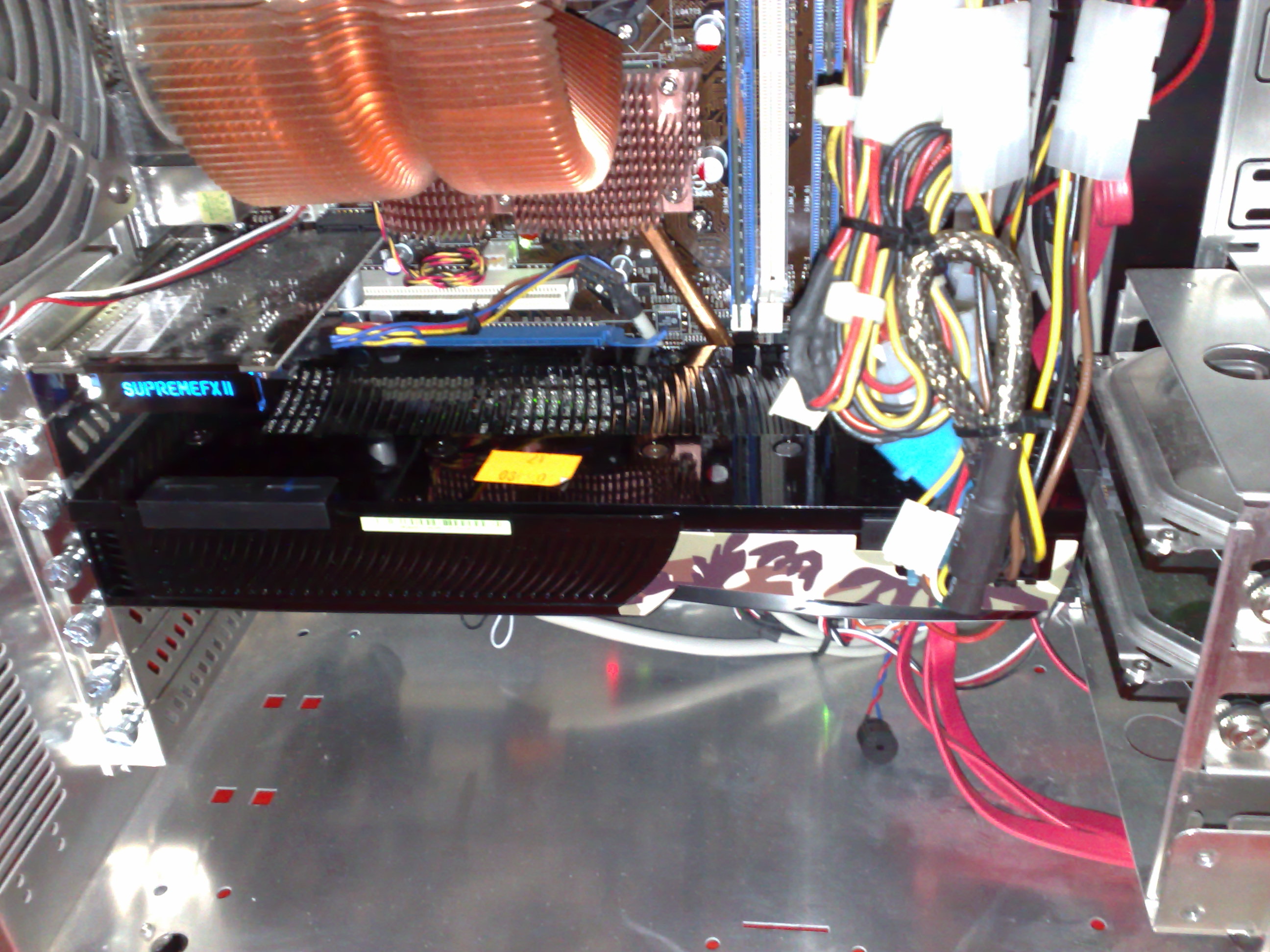 Pues no tengo ninguna comparación de rendimiento echa en comparación con la 8800 GT, pero así a voz de ya creo que, creo que sería más del doble, por ahí ley que son un 74% más que las 8800 GT. Pero exacto no lo sé, lo que sí puedo decir es que es muy grande y así que, hay que tener en cuenta la caja donde se va a meter sino miren esta es una Lian-Li más grande de lo habitual y vean como entra justita.