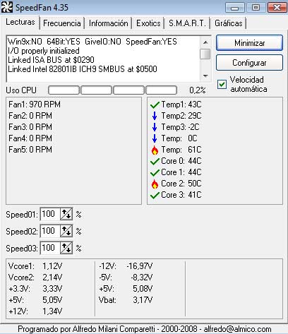 He instalado el Speedfan y he comprobado que la temperatura de la tarjeta gráfica es de unos 61º c en reposo, es decir, usando internet, el emule y poco más. Si le meto caña (he probado con algún juego) cuando salgo a Windows da una temperatura de unos 71º c.