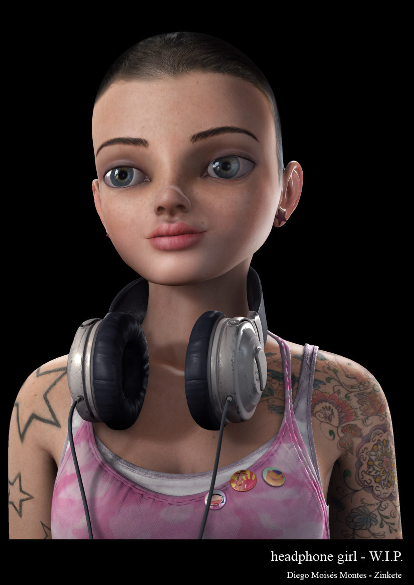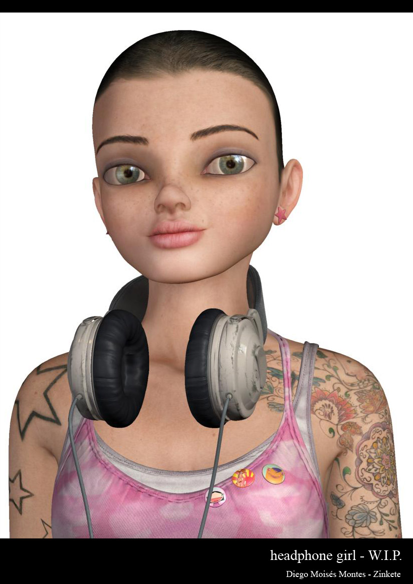 Hola, aquí dejo una actualización, he iluminado para buscar más el contraste y las sombras y he retocado algunos materiales y texturas, aparte le he añadido la oclusión para ir viendo cómo va quedando, aún tengo que retocar los pendientes de estrellitas, que se me han quedado demasiado oscuros, y bajar en el mapa de Bump la fuerza de los tatuajes de estrellas, que está muy acentuado, no sé si se aprecia, pero le he metido la membrana que Infograph comentaba el otro día, aparte he cambiado la dirección de la mirada, pero me parece que se ha quedado un poco bizca y/o estrábica ¿Qué os parece?
