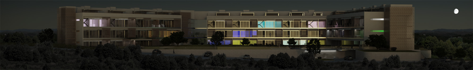 Bueno, os muestro un par de imágenes nocturnas del proyecto en el que actualmente estoy trabajando. Las luces de colores corresponden a cromoterapia existente en cada apartamento.