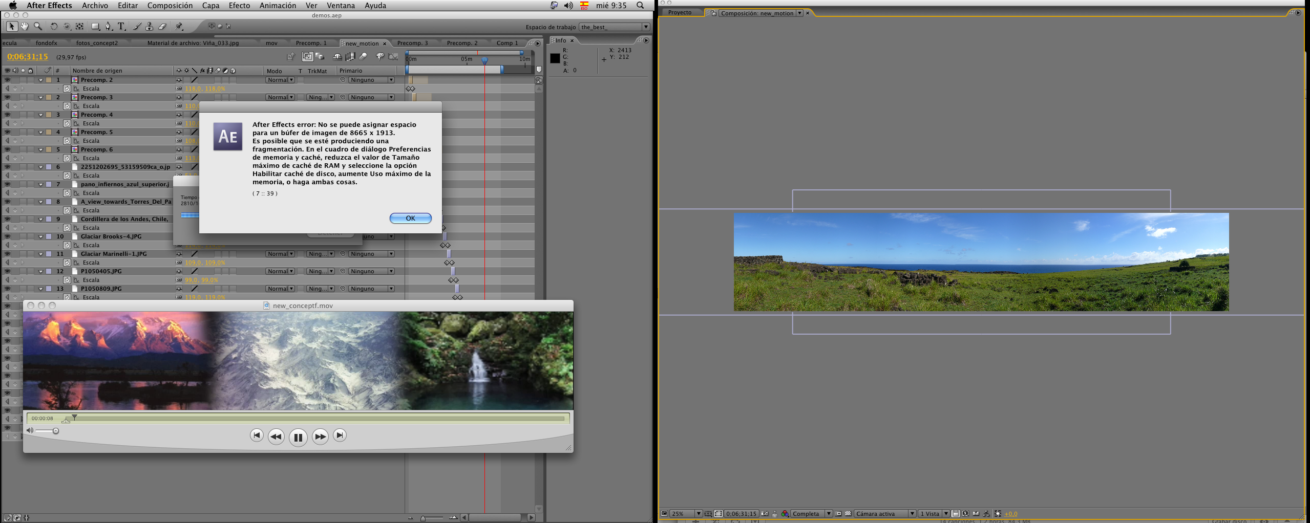 Hola estoy trabajando en un proyecto de multi proyección donde tengo que crear clips de 5000*768 necesito que estos tengan un formato final QuickTime con h264 y esas dimensiones, los clips están montados con after y exportados como secuencia de imágenes debido a que al exportarlos directamente desde After Effects provoca un error de memoria la máquina es un Mac profesional con 6 Gb en Ram he configurado el caché con una carpeta externa y he activado la opción de multiprocesamiento, pero no logro sacar un (*.mov) de forma directa y sin tener que exportar dos veces.