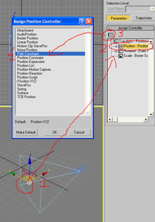 En max, creo que lo que buscas se hace de la siguiente manera: En lugar de cambiar el controlador de posición de position XYZ a Path follow, cambias position XYZ a position list.