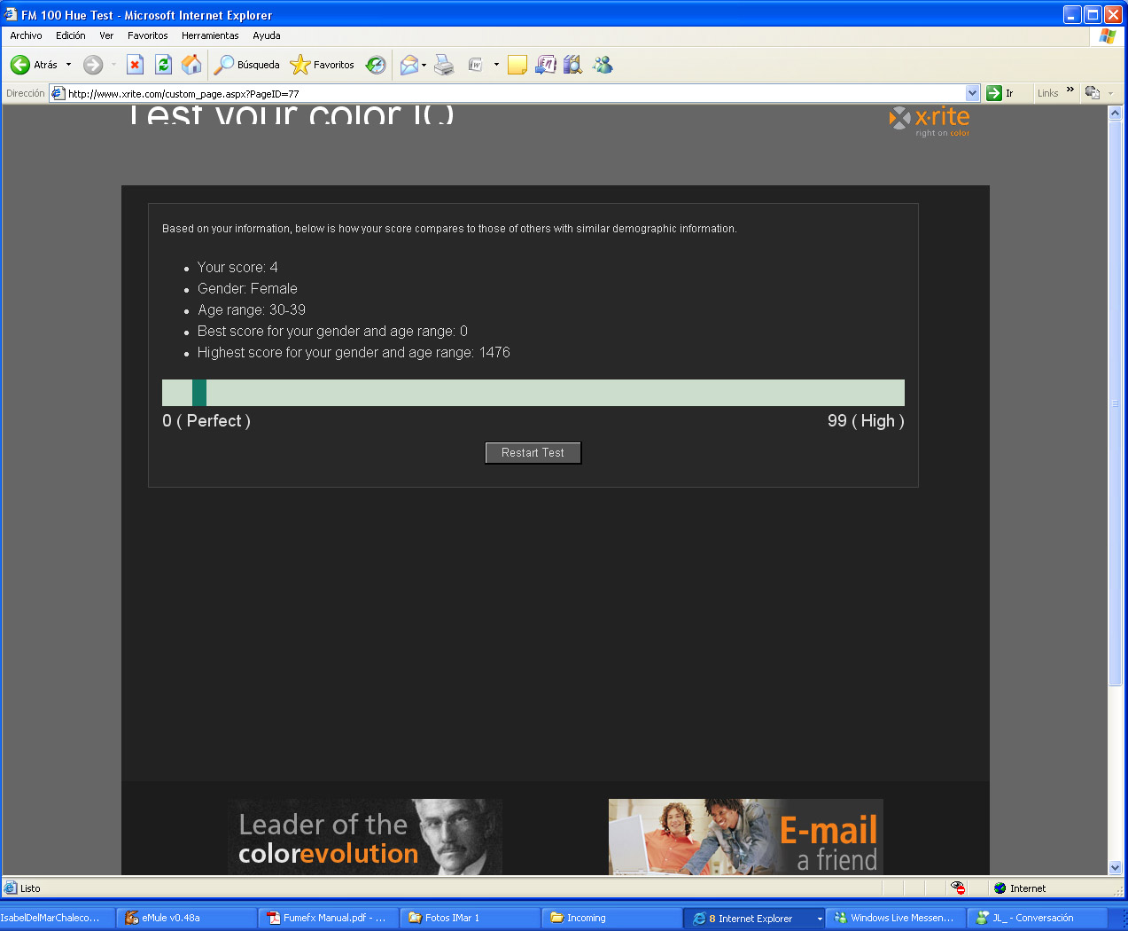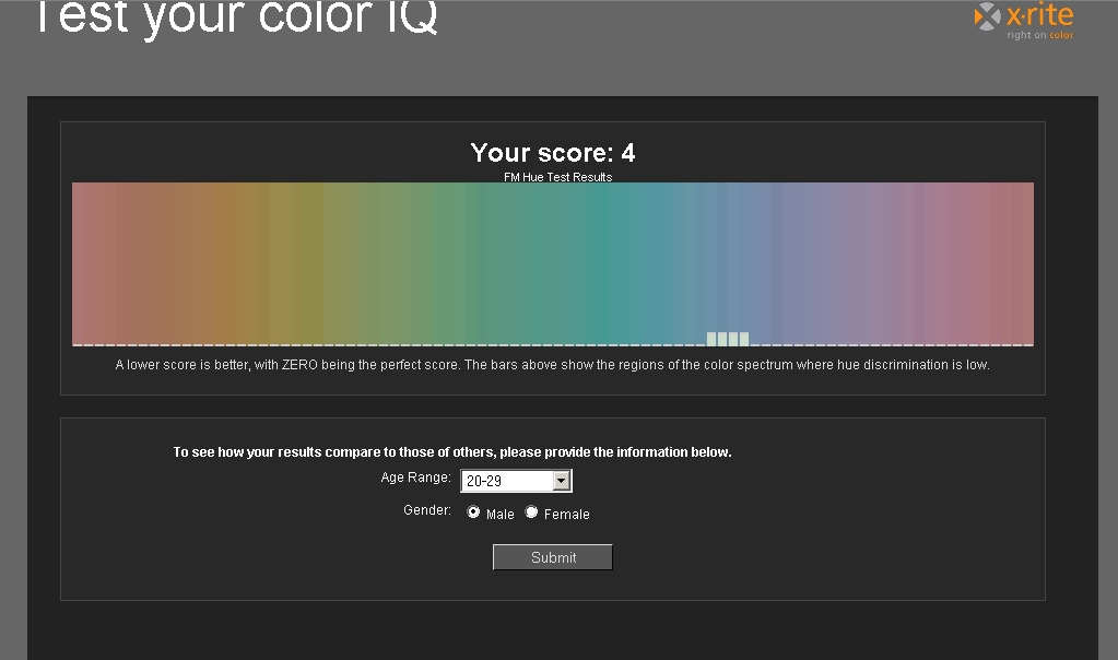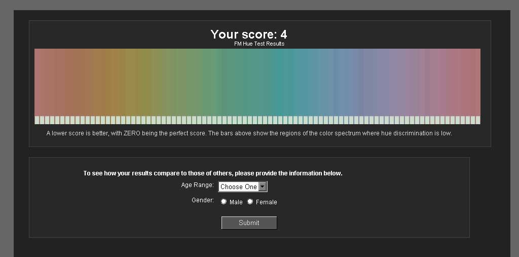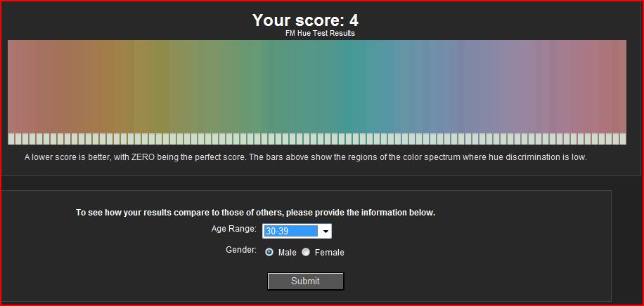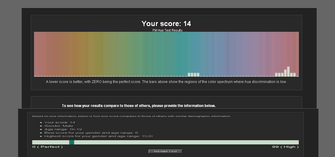 En este test deberemos ordenar las 4 escalas de colores, en cada escala encontraremos dos colores en los extremos que nos servirán de referencia para ir arrastrando los demás cuadros según su orden cromático, al final suministraremos nuestro rango de edad y nuestro sexo (no sé en qué incidirá esto en el resultado) para que nos dé una puntuación, siendo 0 el puntaje perfecto y de 1000 en adelante una cita con el oculista.