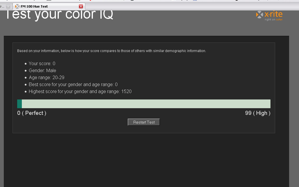 You have perfect color visión. En un CRT calibrado. Qué bien, y eso que tengo astigmatismo en un ojo y miopía en el otro, (¿aunque esto no debería influir en la manera en que aprecio los colores, si me he fijado que con el ojo derecho veo todo con un leve filtro rojizo y con el izquierdo veo todo un poco más azuloso o medio verde, alguien sabe por qué me pasa esto?